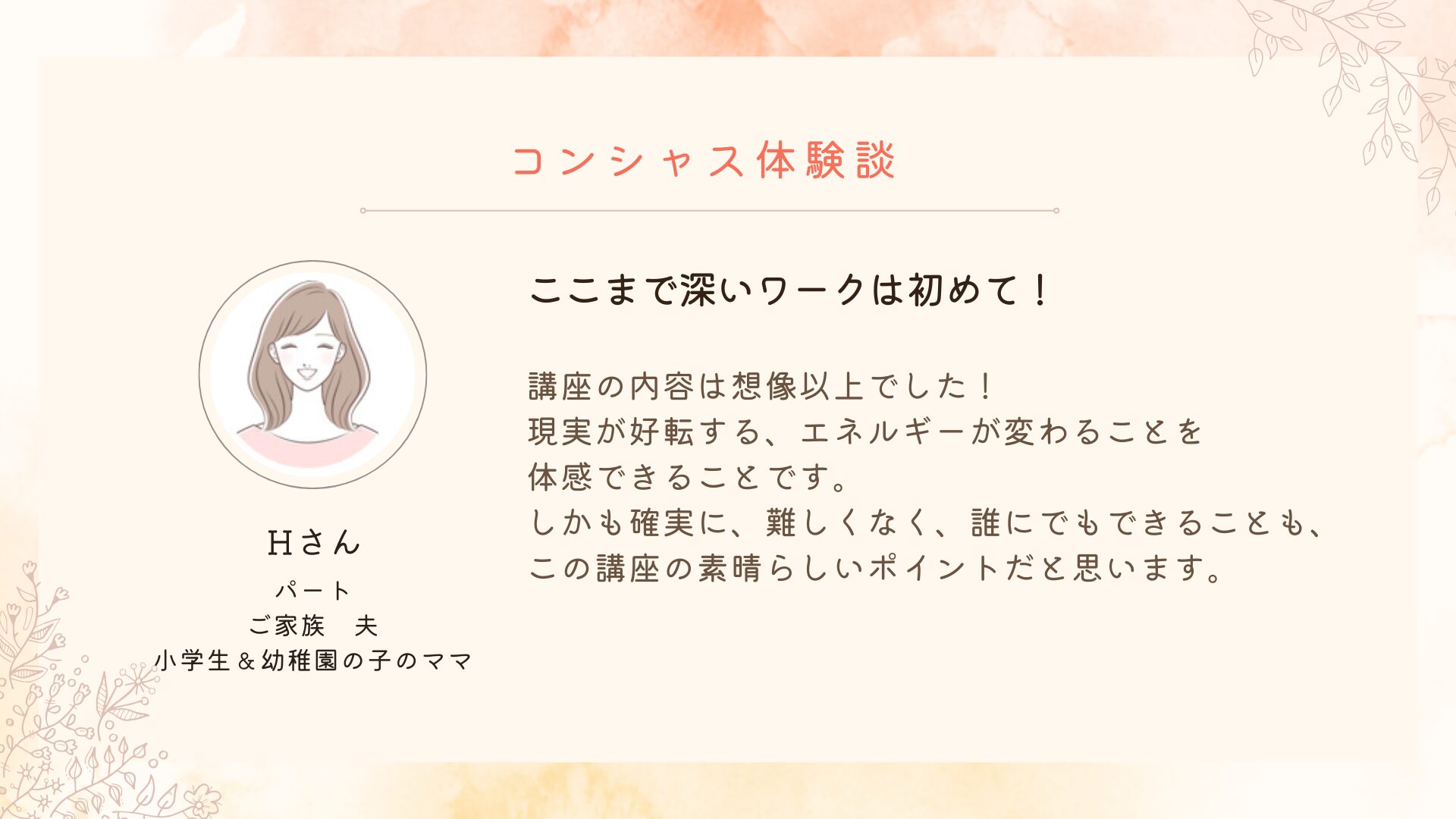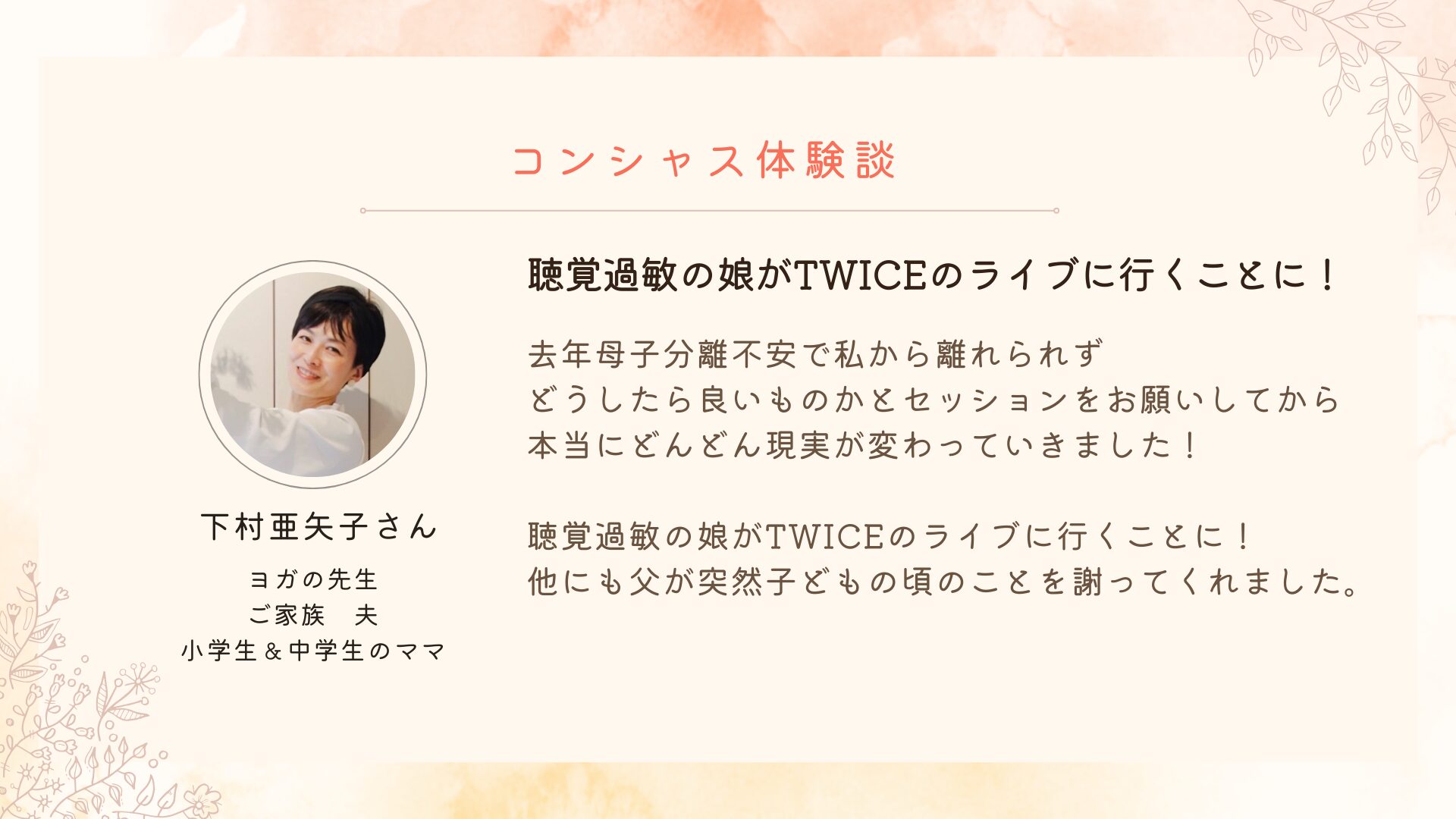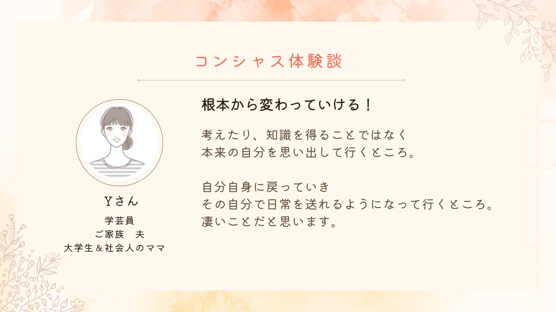 アドバンス講座修了された方対象:フォローアップと毎月ライブ相談会+24時間グループページで相談できる「コンシャスフル®︎コミュニティ」(月額2200円)あり。