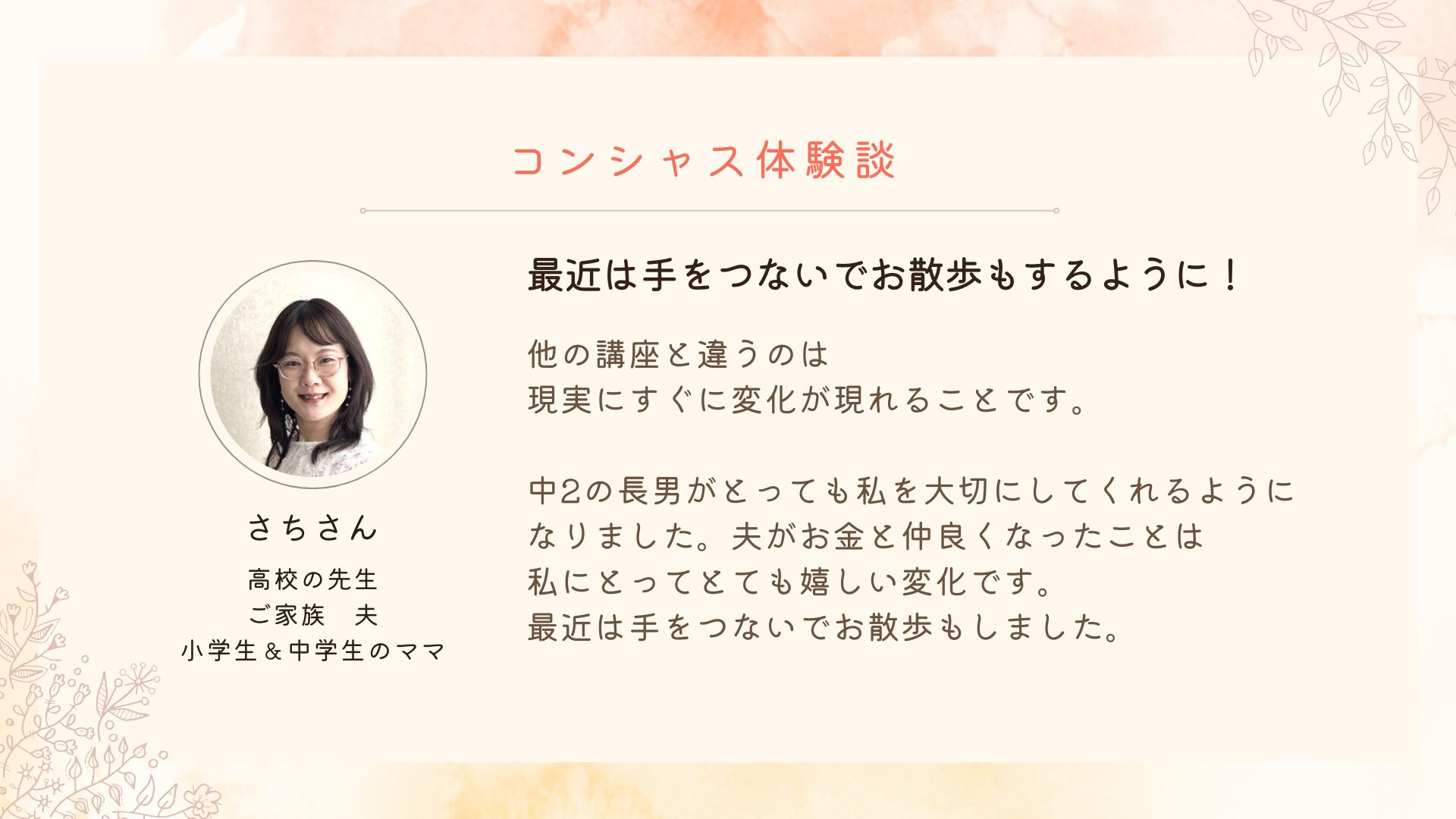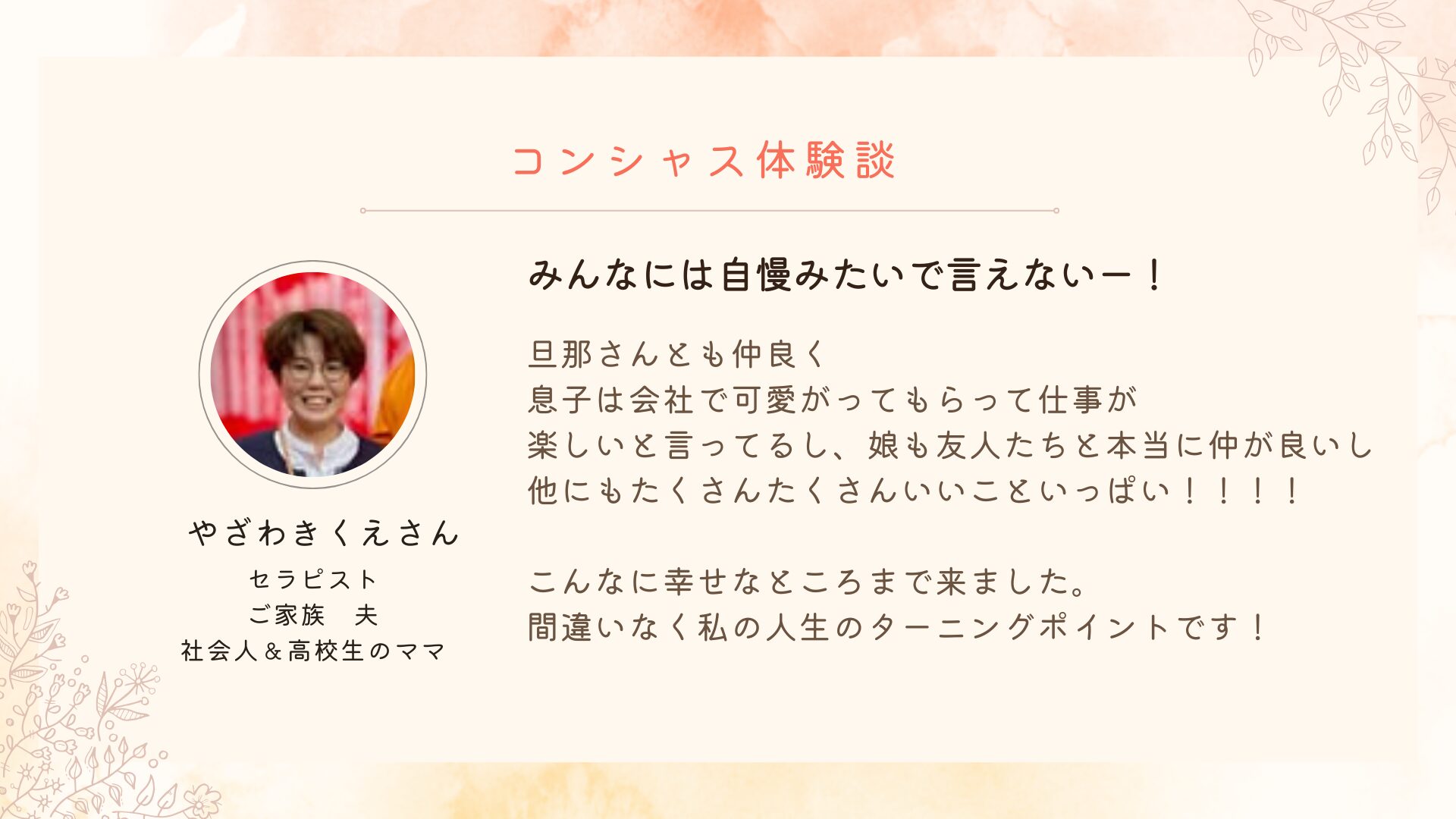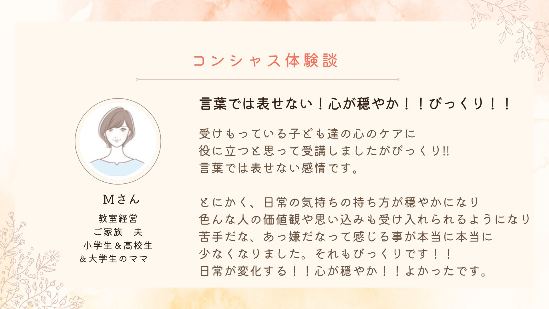 アドバンス講座修了された方対象:フォローアップと毎月ライブ相談会+24時間グループページで相談できる「コンシャスフル®︎コミュニティ」(月額2200円)あり。